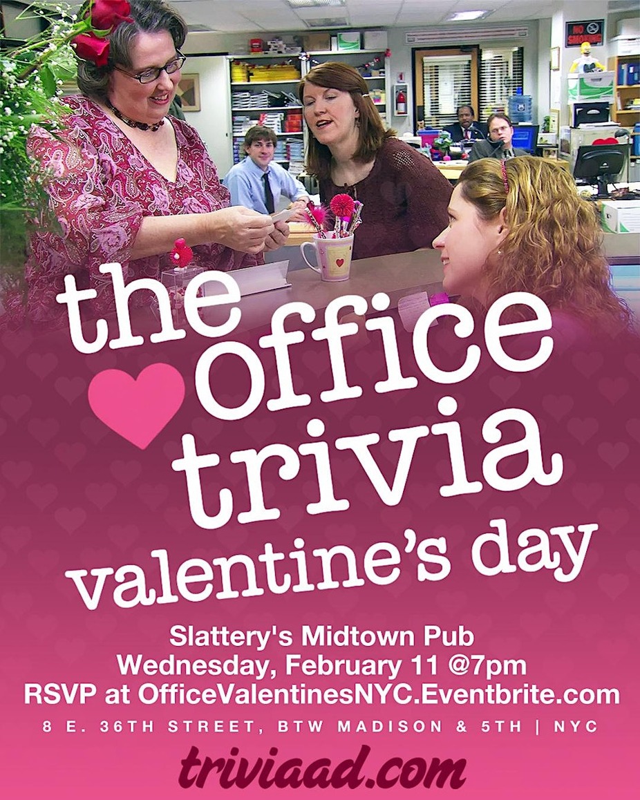 From secret relationships and awkward dates to ill-timed confessions and parking lot proposals, this night is all about The Office and its Valentine’s Day episodes and love stories. Join us at Slattery’s Midtown Pub in NYC on Wednesday, February 11 at 7pm for five rounds of The Office Trivia: Valentine’s Day, covering key episodes, couples, almost-couples, and the moments that made our hearts hurt and our stomachs hurt from laughing. $20 food/drink minimum per person. Reserve yours here: https://OfficeValentinesNYC.Eventbrite.com To reserve a table, please choose one team captain to purchase tickets for your entire group. For example, if Jim, Pam, Dwight, and Angela are a team, Jim should snag four tickets total. Flying solo? No problem — at least you’re not stuck on a blind date set up by Michael. A confirmation email will be sent to all players as we get closer to the event. Love is patient, love is kind, love is… very weird at Dunder Mifflin.