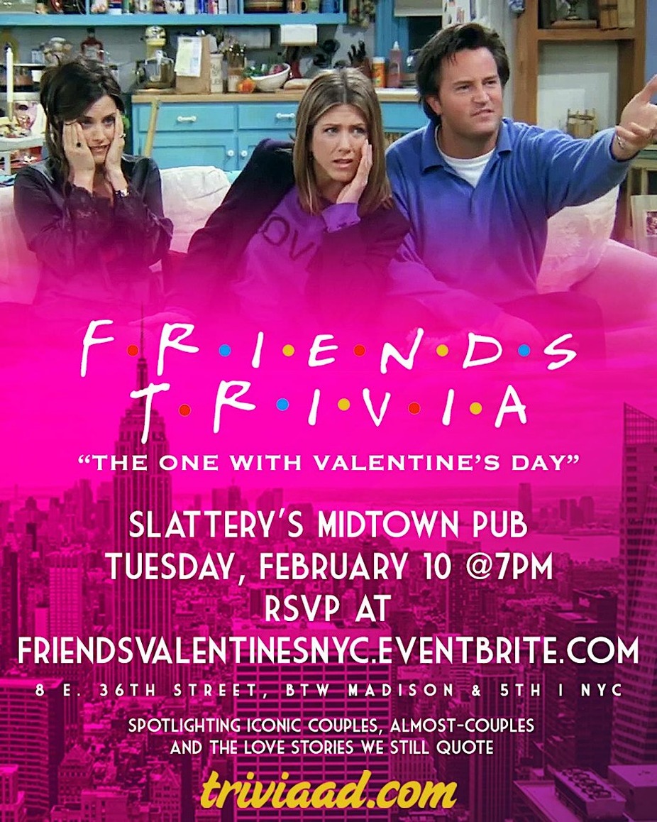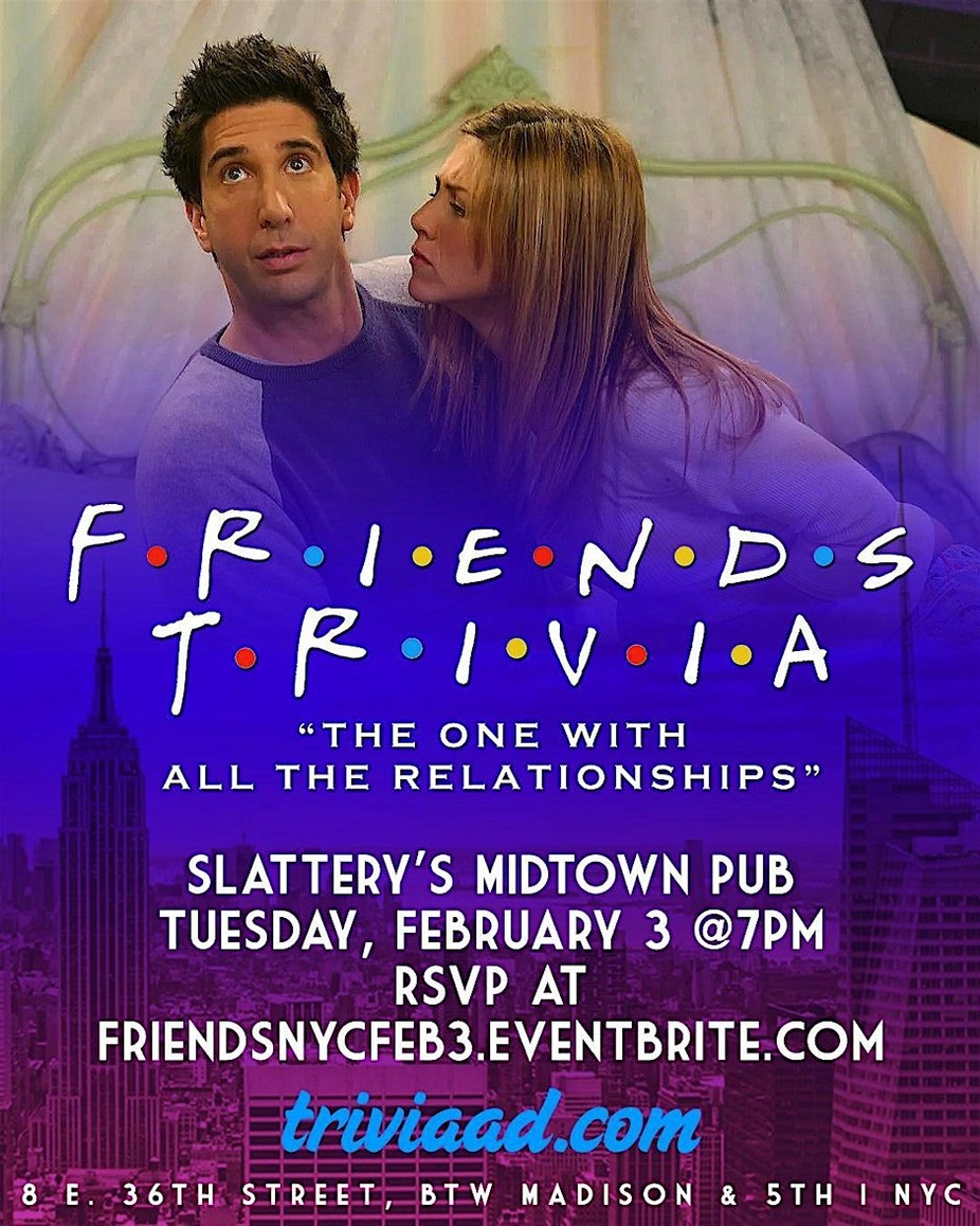 Love triangles, bad breakups, iconic makeups, and “…we were on a break.” This night is dedicated to the relationships, almost-relationships, and absolute disasters that made Friends the perfect comfort show and the messiest dating guide ever. Join us at Slattery’s Midtown Pub in NYC on Tuesday, February 3 at 7pm for five rounds of Friends Trivia: The One With All the Relationships. We’ll cover Ross & Rachel, Monica & Chandler, Phoebe’s soulmates, Joey’s “how you doin’,” and every near-miss, proposal, and prom video along the way. $20 food/drink minimum per person. Reserve yours here: https://FriendsNYCFeb3.Eventbrite.com To reserve a table, please choose one team captain to purchase tickets for your entire group. For example, if Monica, Chandler, Ross, and Rachel are a team, Monica should snag four tickets total. Flying solo? No problem — single tickets are welcome (no plus-one required). A confirmation email will be sent to all players as we get closer to the event. Could this BE a more romantic trivia night?