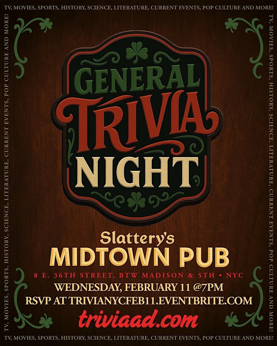General Trivia Night at Slattery’s is your chance to flex every corner of your brain: movies, music, sports, history, TV, pop culture, and the weird internet moments you wish you didn’t remember. Join us at Slattery’s Midtown Pub in NYC on Wednesday, February 11 at 7pm for five rounds of general trivia. $20 food/drink minimum per person. Reserve yours here: https://TriviaNYCFeb11.Eventbrite.com To reserve a table, please choose one team captain to purchase tickets for your entire group. For example, if Inky, Blinky, Pinky, and Clyde are a team, Inky should snag four tickets total. Flying solo? No problem — single tickets are welcome. A confirmation email will be sent to all players as we get closer to the event. The questions are ready. Are you?