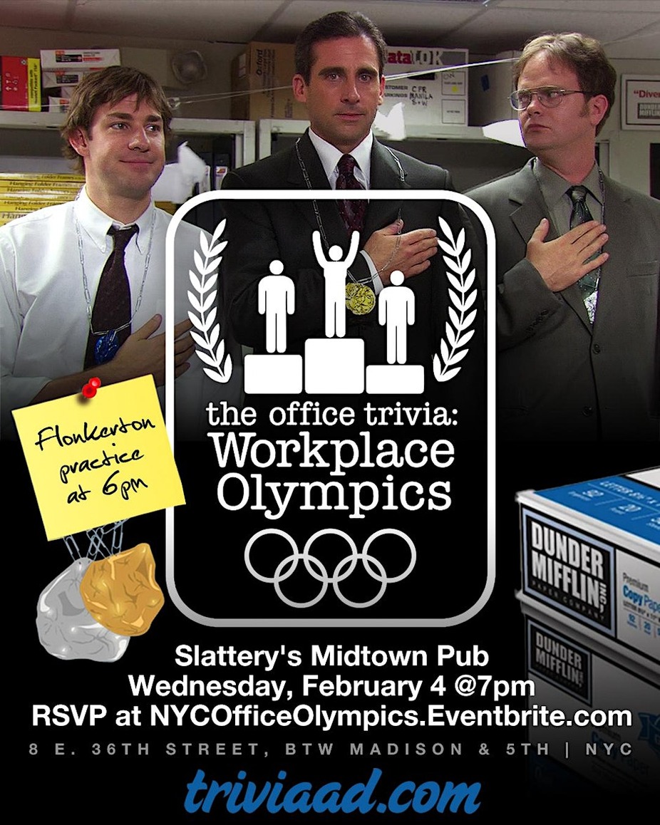 Break out your Flonkerton skills and prepare your medals made of yogurt lids — this night is dedicated to The Office and the legendary “Office Olympics” episode, plus workplace shenanigans across the series. Join us at Slattery’s Midtown Pub in NYC on Monday, January 26 at 7pm for five rounds of The Office trivia celebrating Workplace Olympics, office pranks, and classic Dunder Mifflin chaos. $20 food/drink minimum per person. Reserve yours here: https://OfficeOlympicsNYC.Eventbrite.com To reserve a table, please choose one team captain to purchase tickets for your entire group. For example, if Jim, Pam, Dwight, and Oscar are a team, Jim should snag four tickets total. Flying solo? No problem — single tickets are welcome. A confirmation email will be sent to all players as we get closer to the event. In the end, the real gold medal is the trivia we played along the way.