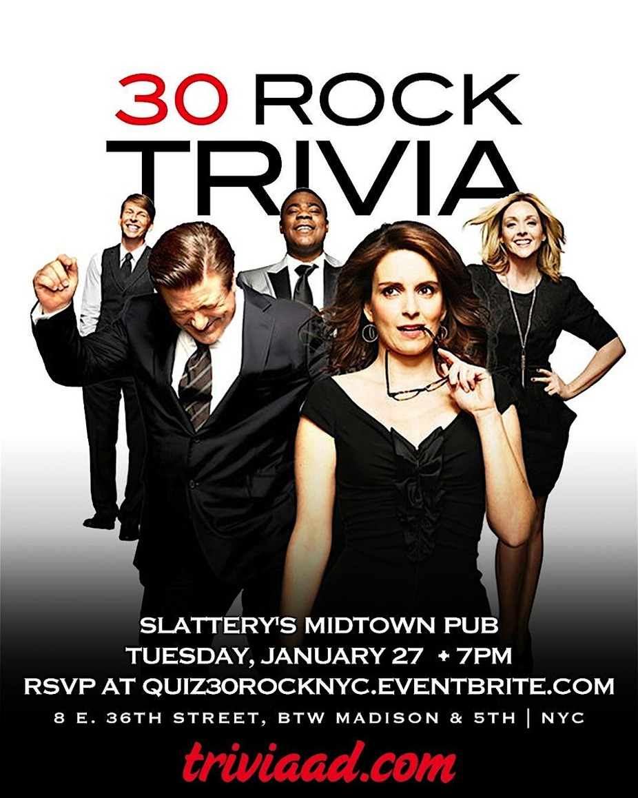 Step into 30 Rockefeller Plaza for a night of TGS drama, night cheese, page antics, GE/NBC ridiculousness, and Liz just trying to have it all while eating sandwiches over the sink. Join us at Slattery’s Midtown Pub in NYC on Tuesday, January 27 at 7pm for five rounds of 30 Rock trivia covering episodes, quotes, characters, and the most absurd moments from the series. Reserve yours here: https://Quiz30RockNYC.Eventbrite.com To reserve a table, please choose one team captain to purchase tickets for your entire group. For example, if Liz, Jack, Tracy, and Jenna are a team, Liz should snag four tickets total. Flying solo? No problem — single tickets are welcome. A confirmation email will be sent to all players as we get closer to the event. Live every week like it’s trivia week.