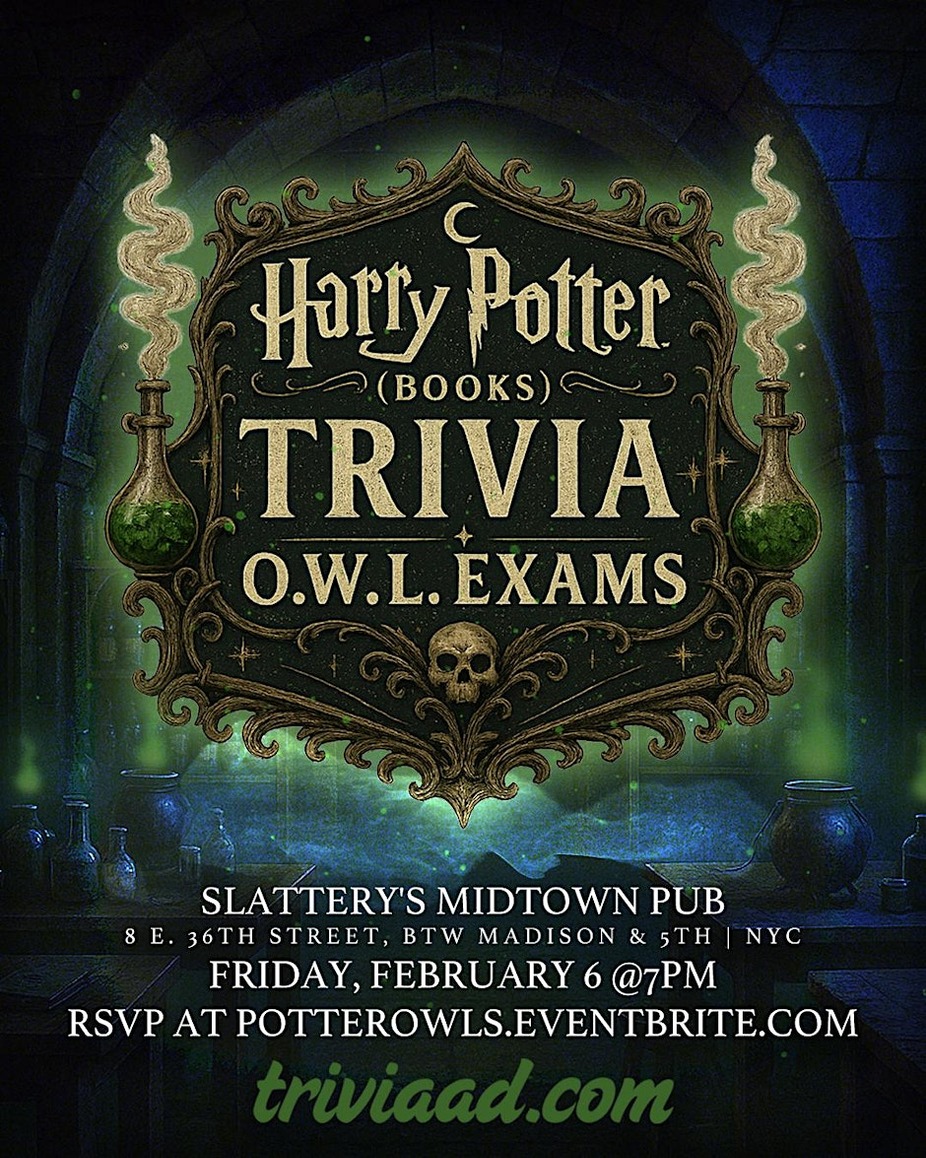 Wands at the ready — this one’s all about the books. From Sorcerer’s Stone to Deathly Hallows, we’ll be testing your knowledge of spells, creatures, characters, obscure details, and the tiniest corners of the wizarding world. Join us at Slattery’s Midtown Pub in NYC on Friday, February 6 at 7pm for five challenging rounds of Harry Potter (Books) Trivia: O.W.L. Exams. $20 food/drink minimum per person. Reserve yours here: https://PotterOWLS.Eventbrite.com To reserve a table, please choose one team captain to purchase tickets for your entire group. For example, if Harry, Hermione, Ron, and Luna are a team, Hermione should snag four tickets total. Flying solo? No problem — single tickets are welcome. A confirmation email will be sent to all players as we get closer to the event. Just remember: help will always be given at trivia to those who ask for it.