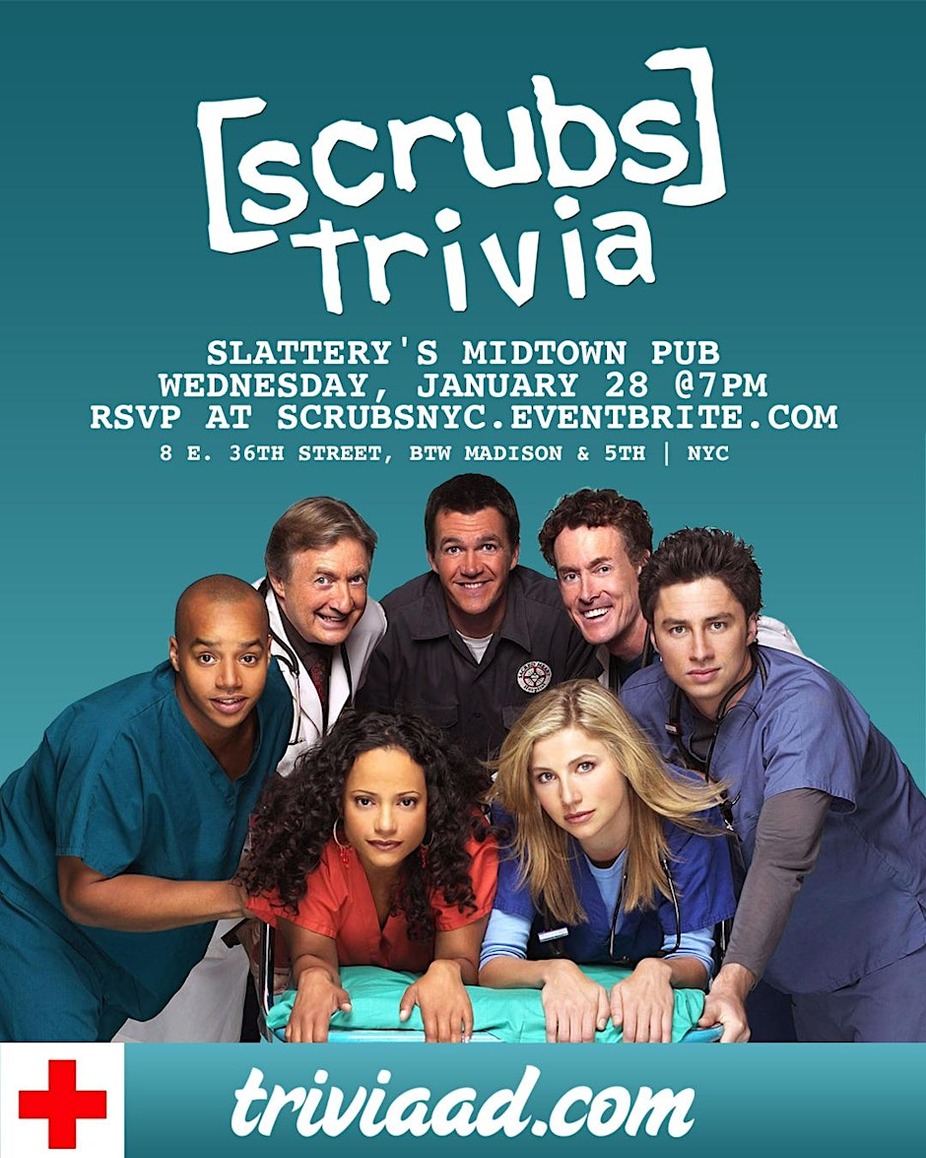 From daydreams and inner monologues to bromances, heartbreak, and life lessons inside Sacred Heart, this night is all about Scrubs — the laughs, the tears, and everything in between. Join us at Slattery’s Midtown Pub in NYC on Wednesday, January 28 at 7pm for five rounds of Scrubs trivia covering episodes, characters, relationships, and quotes from across the series. $20 food/drink minimum per person. Reserve yours here: https://ScrubsNYC.Eventbrite.com To reserve a table, please choose one team captain to purchase tickets for your entire group. For example, if J.D., Turk, Carla, and Elliot are a team, J.D. should snag four tickets total. Flying solo? No problem — single tickets are welcome. A confirmation email will be sent to all players as we get closer to the event. It’s time to test whether you really know your way around Sacred Heart.