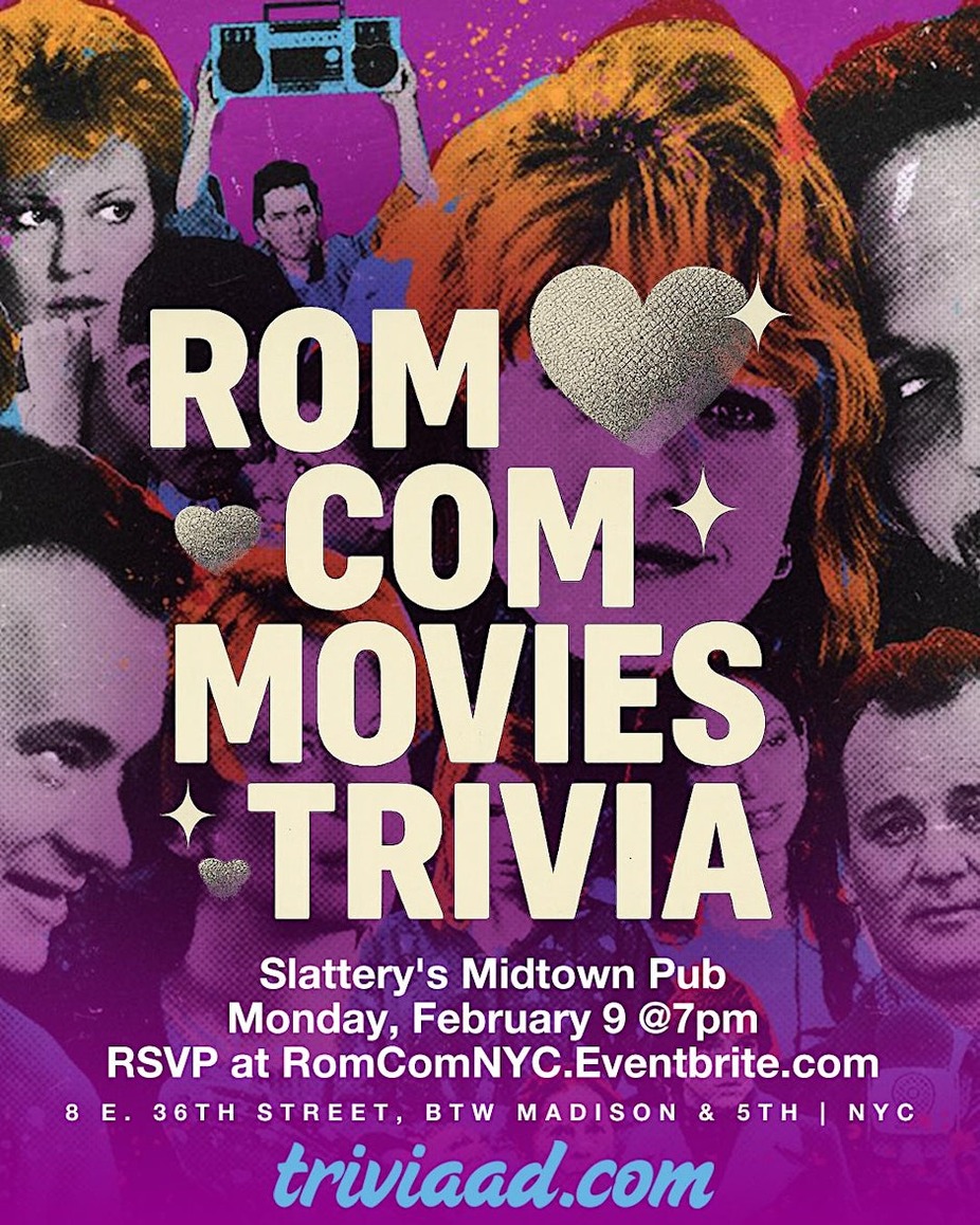 From fake relationships and meet-cutes to rooftop declarations, grand gestures, and “it’s always been you,” this night is dedicated to the romantic comedies you know by heart. Think When Harry Met Sally, 10 Things I Hate About You, The Proposal, Crazy Rich Asians, and more. Join us at Slattery’s Midtown Pub in NYC on Monday, February 9 at 7pm for five heart-eyed rounds of Rom Com trivia. $20 food/drink minimum per person. Reserve yours here: https://RomComNYC.Eventbrite.com To reserve a table, please choose one team captain to purchase tickets for your entire group. For example, if Harry, Sally, Bridget, and Lara Jean are a team, Harry should snag four tickets total. Flying solo? No problem — consider this your own main-character moment. A confirmation email will be sent to all players as we get closer to the event. Love means never having to say, “I forgot trivia night.”