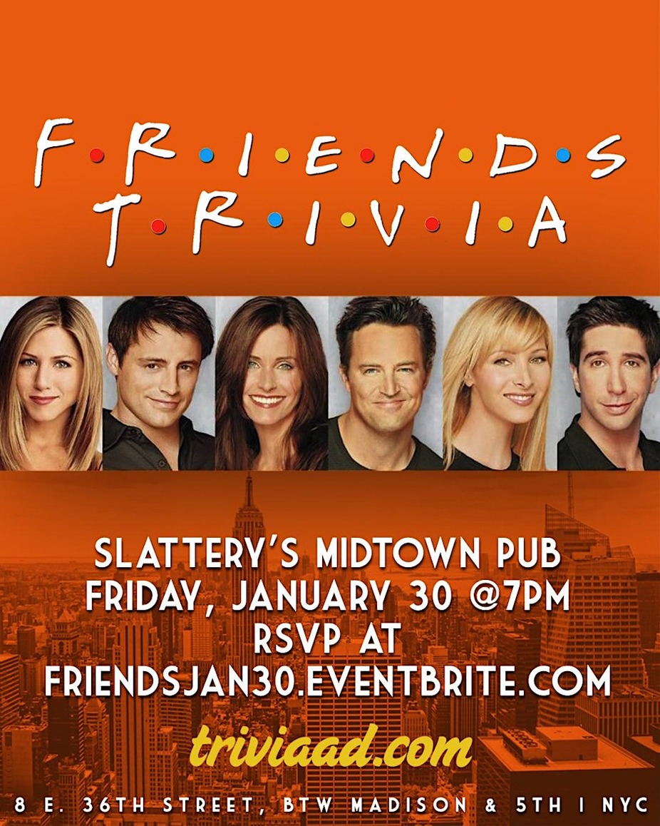 Pivot into a night of couch moves, lobster talk, thanksgiving disasters, break debates, and smelly cats. This is a full-on celebration of Friends across all 10 seasons — the relationships, the running gags, and the quotes you’ve had memorized since the DVDs. Join us at Slattery’s Midtown Pub in NYC on Friday, January 30 at 7pm for five rounds of Friends trivia spanning the entire series. $20 food/drink minimum per person. Reserve yours here: https://FriendsJan30.Eventbrite.com To reserve a table, please choose one team captain to purchase tickets for your entire group. For example, if Monica, Chandler, Joey, and Phoebe are a team, Monica should snag four tickets total. Flying solo? No problem — single tickets are welcome. A confirmation email will be sent to all players as we get closer to the event. I’ll be there for you… but you still have to answer the questions.