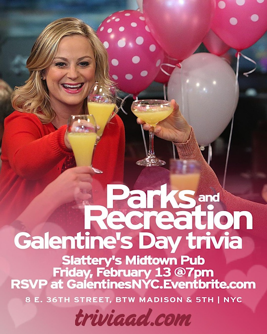 Round up your beautiful tropical fish, rule-breaking moths, and poetic, noble land mermaids — this night is all about Parks and Recreation and the perfect holiday that is Galentine’s Day. We’ll cover waffles, city hall chaos, friendships, love stories, small horse royalty, and everything great about Pawnee. Join us at Slattery’s Midtown Pub in NYC on Friday, February 13 at 7pm for five rounds of Parks and Rec Trivia: Galentine’s Day. $20 food/drink minimum per person. Reserve yours here: https://GalentinesNYC.Eventbrite.com To reserve a table, please choose one team captain to purchase tickets for your entire group. For example, if Leslie, Ann, April, and Donna are a team, Leslie should snag four tickets total. Flying solo? No problem — it’s still all about celebrating you. A confirmation email will be sent to all players as we get closer to the event. Hoes before bros. Uteruses before duderuses. Trivia before everything.